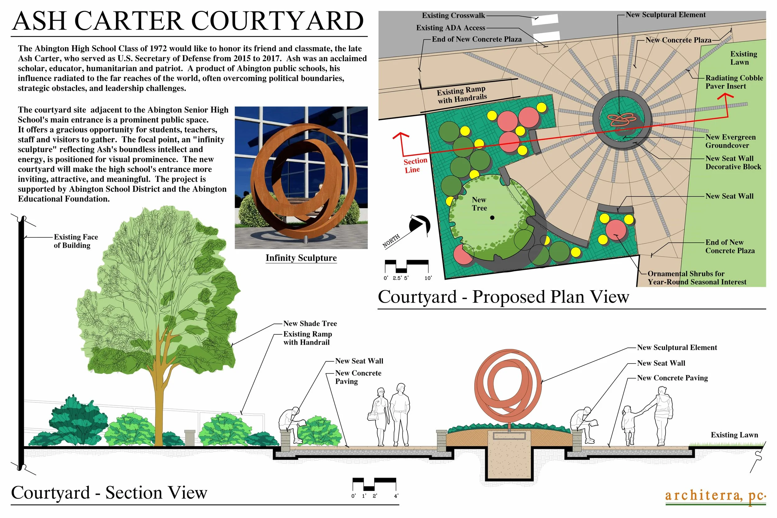 It will be enveloped in beautiful and natural aesthetics and will feature an eye-catching colorful "infinity" sculpture representing Ash's spirit and his expertise in the sciences. The Ash Carter Courtyard will provide a place for students, teachers, staff, and visitors to reflect, relax, and connect while on campus.